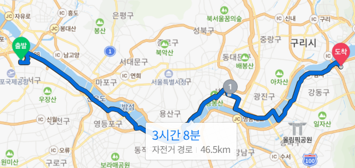 도전 코스는 한강의 서쪽 끝인 방화역에서 동쪽 끝인 하남까지 일주하는 코스로 정했다.