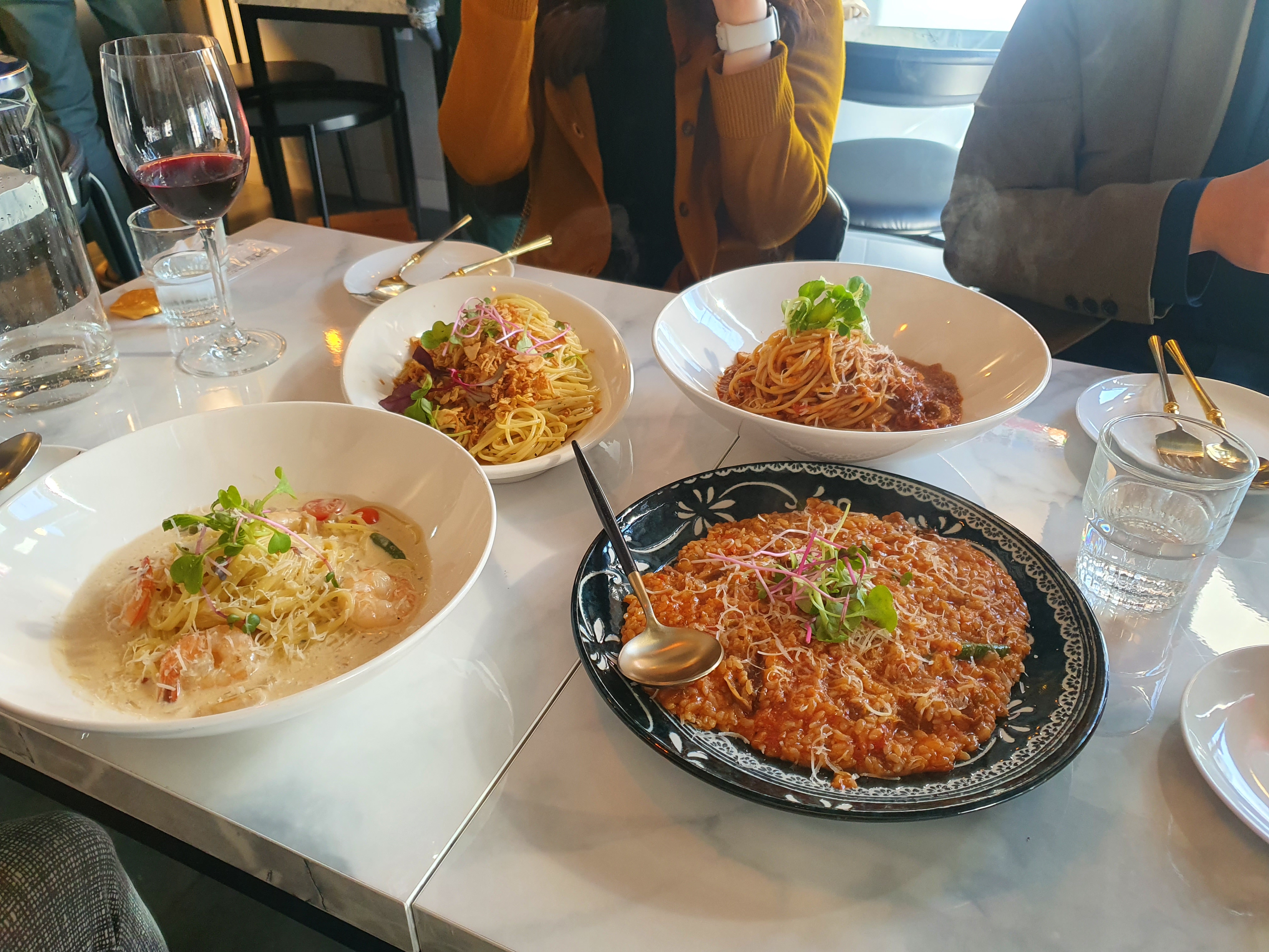 우리는 여러 파스타(크림 슈림프, 라구, 할라피뇨)와 토마토 리조또 그리고 양갈비 스테이크를 주문했다.